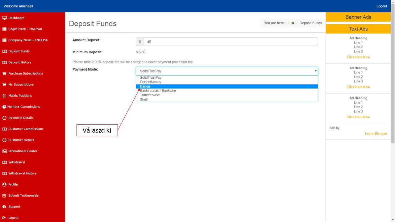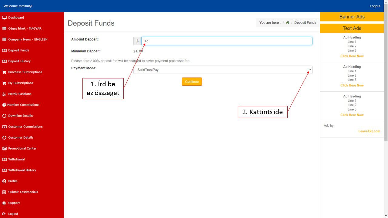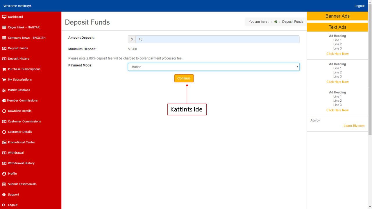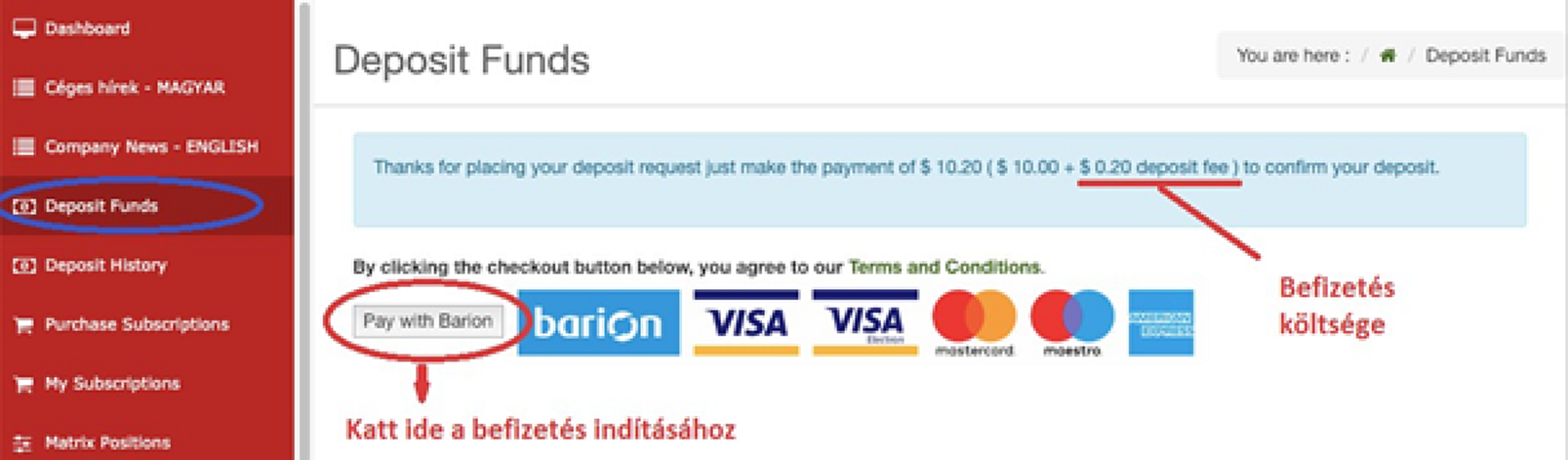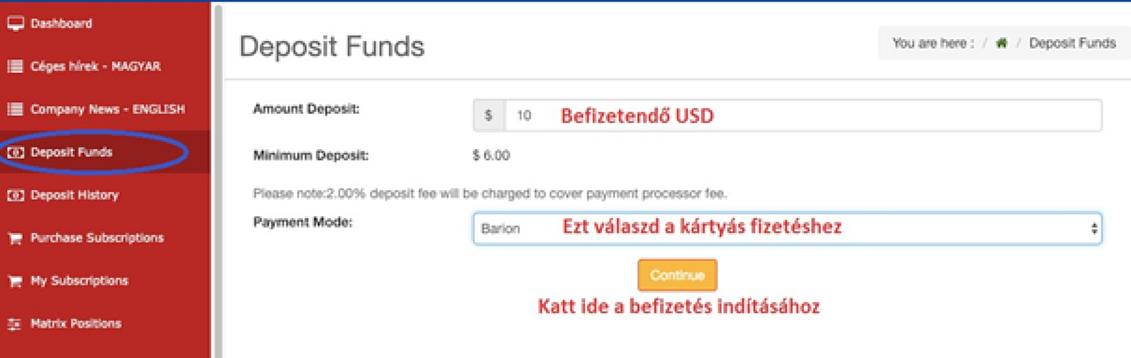 1. A „Deposit Funds” menüpont alatt tudsz befizetést kezdeményezni, a Bankkártyádról is. Add meg a befizetendő összeget (USA dollár), a Fizetési módnál választd ki a „Barion” fizetési módot. Majd katt a „Continue”-ra.