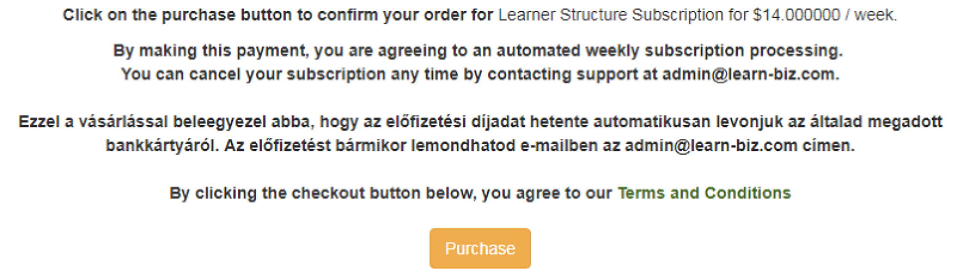 6. A sárga Purchase (Vásárlás) gombra kattintva tudod megvásárolni a Learner előfizetést és pozíciót.